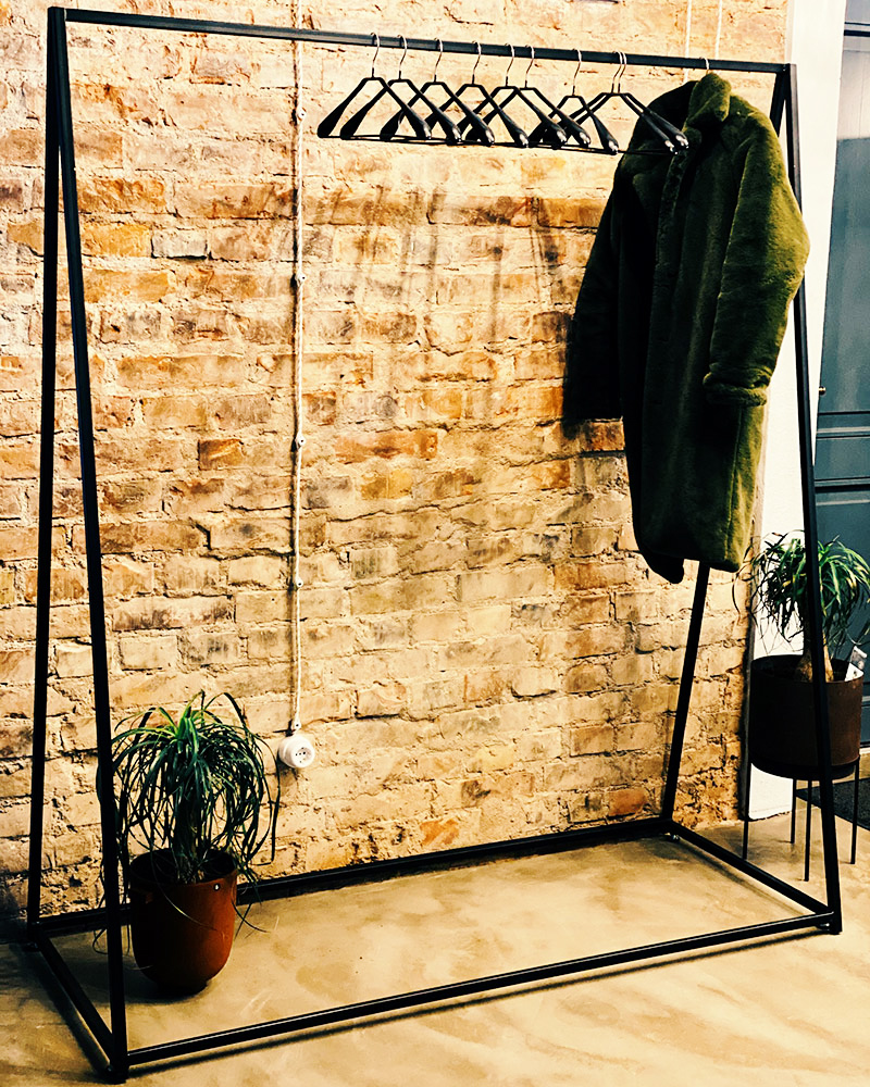 Izturīgs un ietilpīgs drēbju pakaramais statīvs.